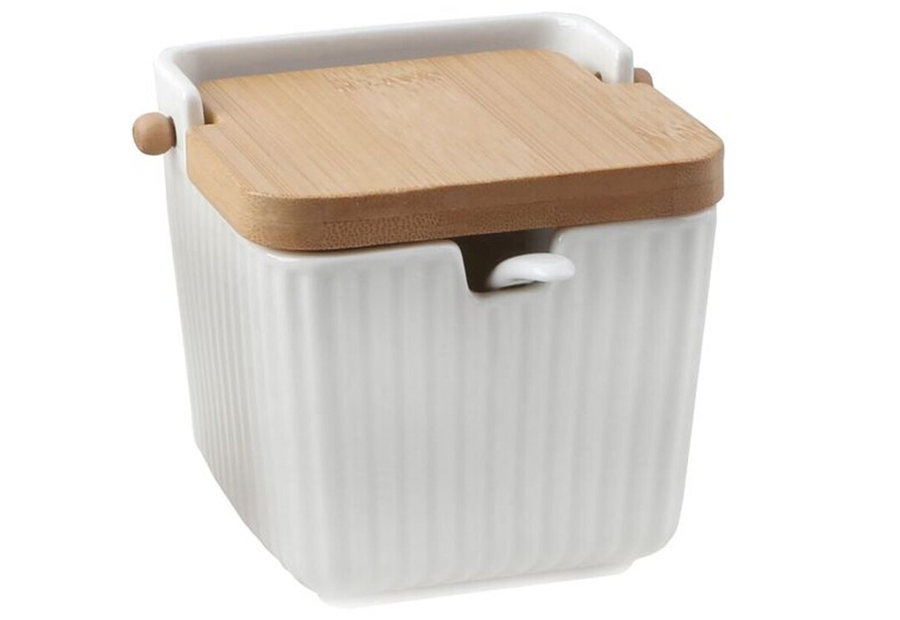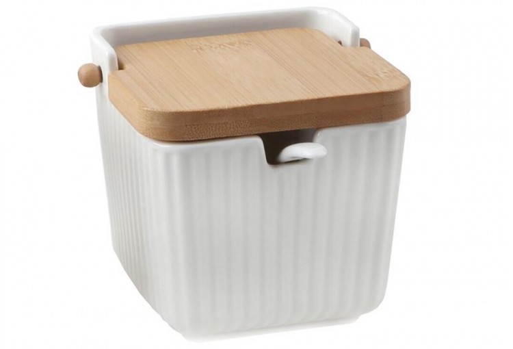 Azucarero con cuchara de la marca D'CASA. Material: Porcelana Grabada y Madera Bambú. Tamaño: 10,5x9,5x9 cm. Packaging en caja de cartón impresa.