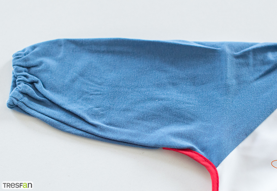 Babero con mangas en tejido textil de algodón de la marca Gamberritos. Tamaño: 33x42 cm. Composición: Mangas algodón - resto babero poliéster PU. Packaging en percha para colgar y bolsa de pvc protectora. Cierre en velcro en el cuello. Puños ajustables. Babero ribeteado.
