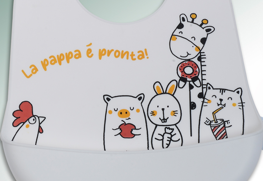 Babero recogemigas de silicona estampado de la marca Gamberritos. Tamaño babero: 23x30 cm. Packaging en bolsa de pvc. Cinco colores disponibles: azul, blanco, gris, verde y rosa. Packaging en bolsa de pvc protectora y percha colgable.