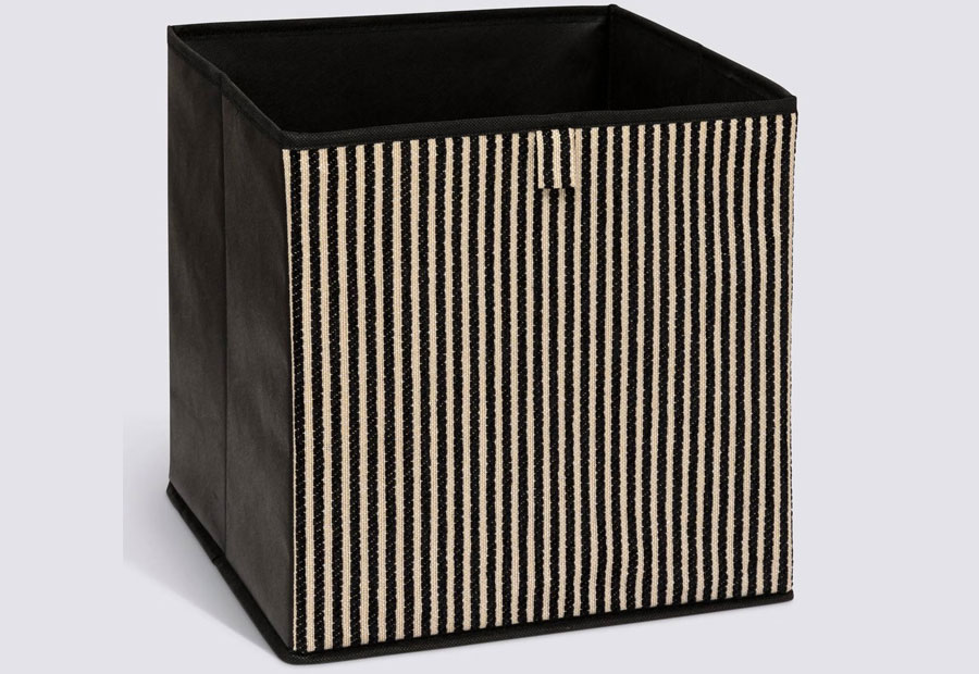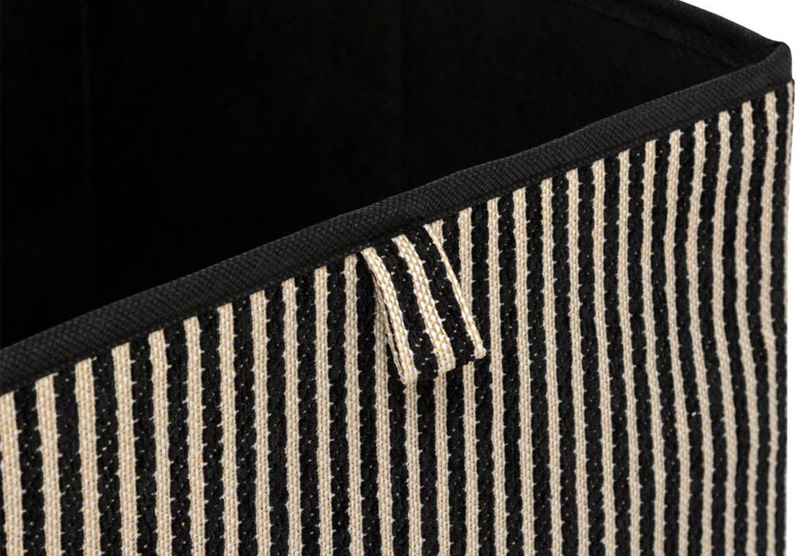 Caja plegable con frontal a rayas de chenilla de almacenamiento de la marca 5Five. Tamaño: 31x31x31 cm. Material: PP, poliéster y cartón. Peso: 0,64 kg. Packaging colgable.