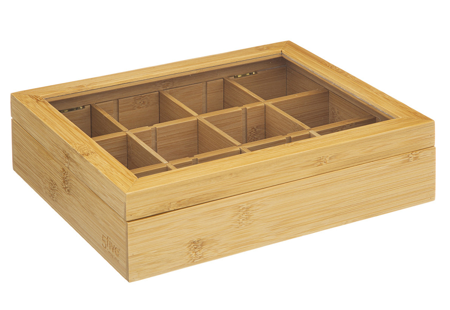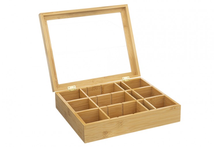 Caja para infusiones de bambú con doce compartimientos extraíbles de la marca Atmosphera. Tamaño: 23x28x7 cm.