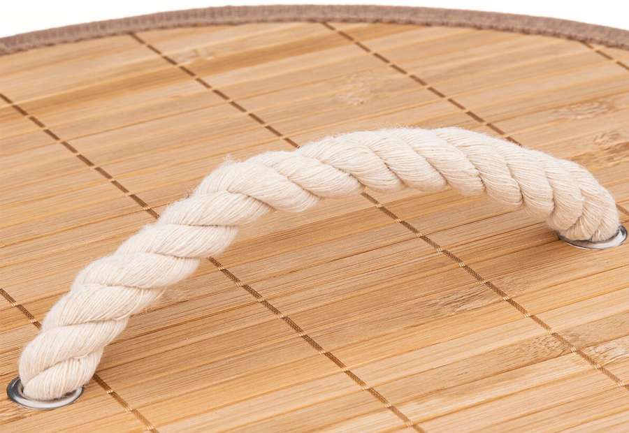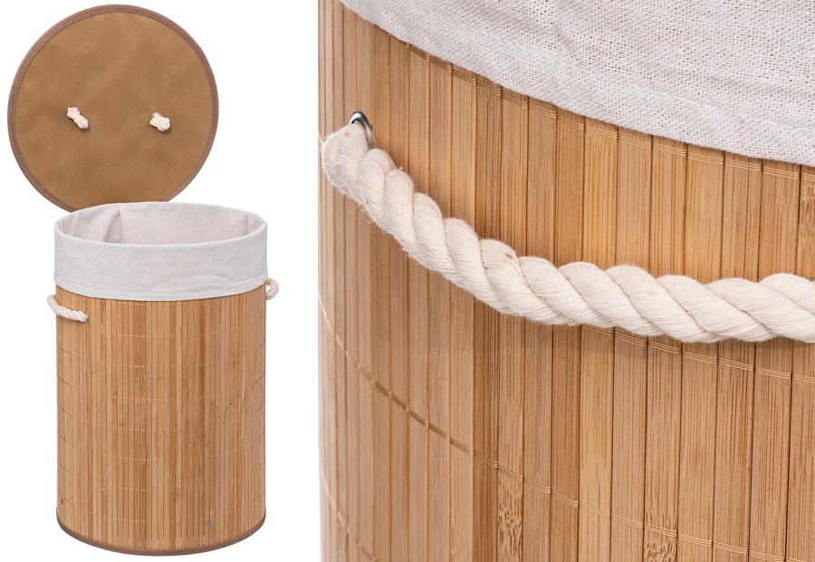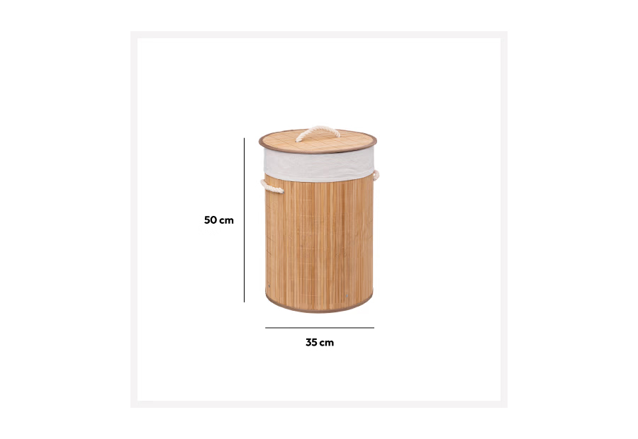 Cesto para la colada redondo de la marca 5FIVE. Capacidad: 48L. Material: Bambú, acero, algodón, poliéster y madera. Tamaño: 35x50 cm. Peso: 1,36 kg. Cesto plegable.