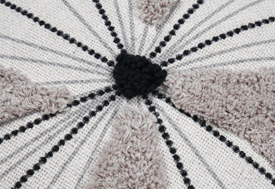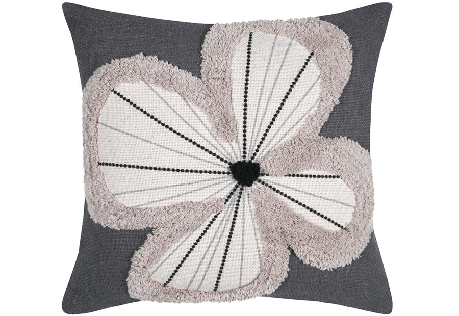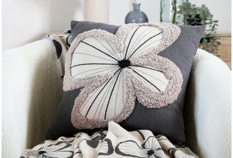 Cojín elegante y moderno con el contorno de la flor en relieve suave de la marca Stof. Tejido 100% algodón. Tamaño: 40x40 cm. Cierre en cremallera invisible. Packaging envasado al vacio con bolsa protectora de pvc y etiqueta.