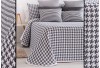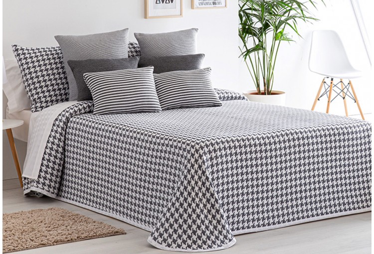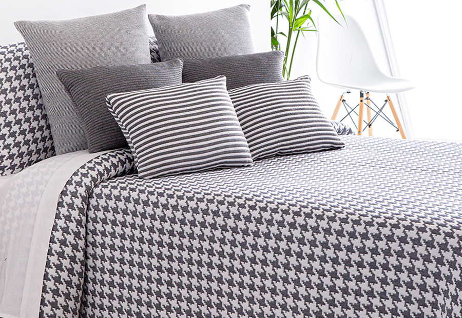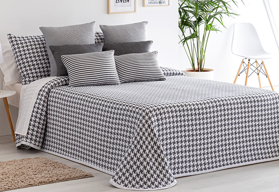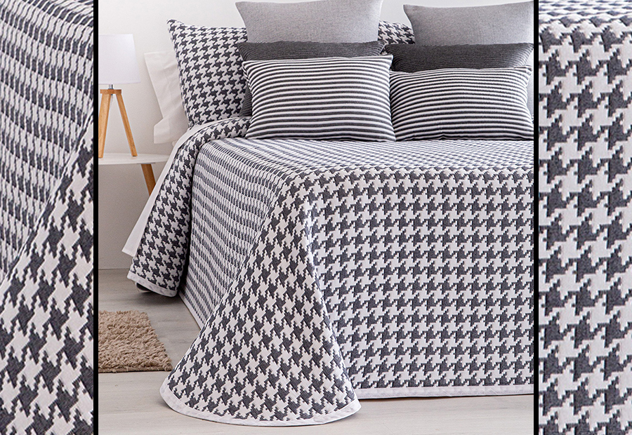 Colcha jacquard tejida con dibujo de pata de gallo de la marca Barceló.