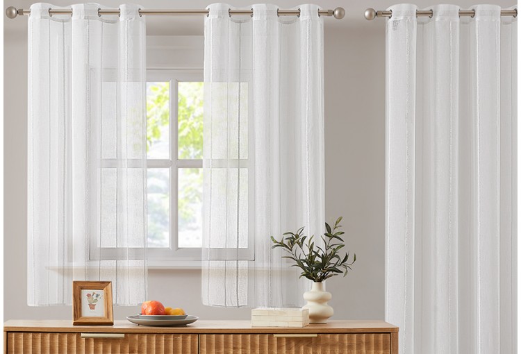 Cortina confeccionada de visillo de cocina de la marca Impronta. Visillo con detalle de rayas verticales. Composición: 100% Poliéster. Dos tamaños disponibles: Pack 2 cortina de ventana de 100x150 cm y Cortina puerta de 150x225 cm. Packaging en bolsa de pvc con percha colgable y cartón impreso con fotografia e información. Cortina con anillas de acero inoxidable.
