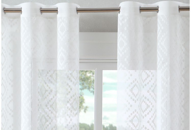 Cortina confeccionada de visillo de cocina de la marca Impronta. Visillo con rombos de jacquard blancos. Composición: 100% Poliéster. Dos tamaños disponibles: Pack 2 cortina de ventana de 100x150 cm y Cortina puerta de 150x225 cm. Packaging en bolsa de pvc con percha colgable y cartón impreso con fotografia e información. Cortina con anillas de acero inoxidable.