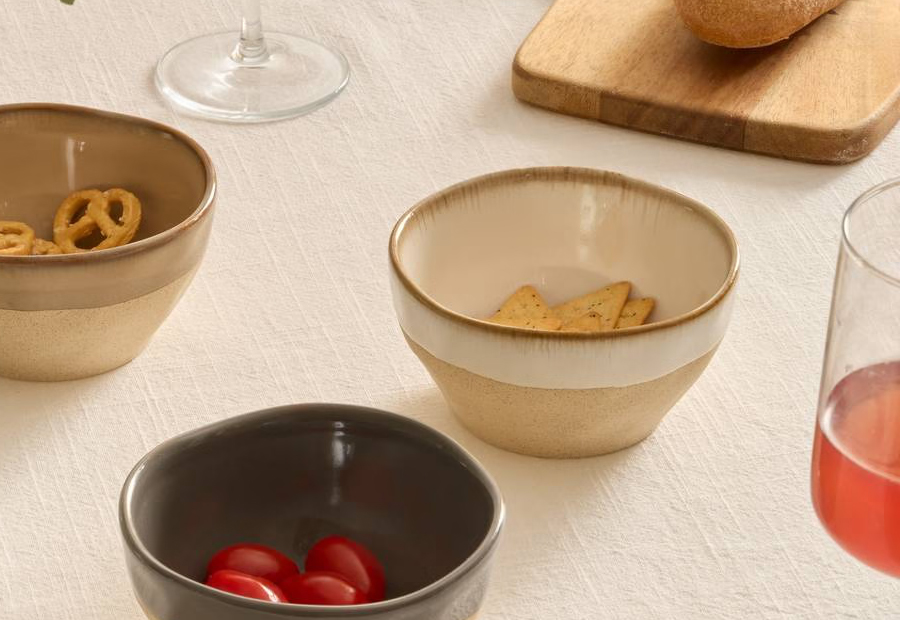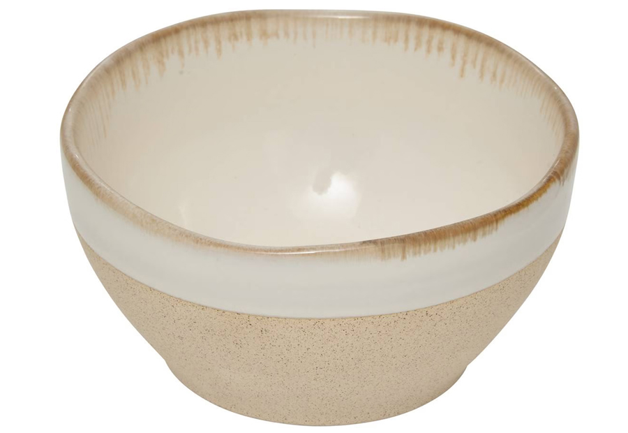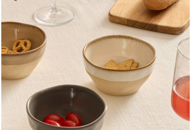 Cuenco aperitivo con aspecto natural y artesanal de la marca Atmosphera. Capacidad: 300 ml. Material: Loza de barro. Tamaño: 11,2 x 5,5 cm. Peso: 0,22 kg. Apta para lavavajillas y microondas. Packaging a granel con etiqueta impresa.