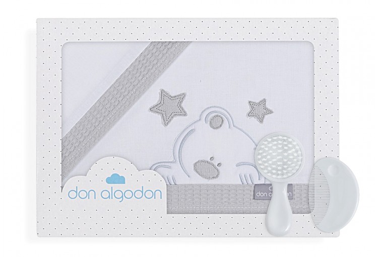 Sábana de bebé bordada con aplicación de jacquard de piqué para cuna de la marca Don Algodon by Interbaby. Detalle de regalo de peine y cepillo.