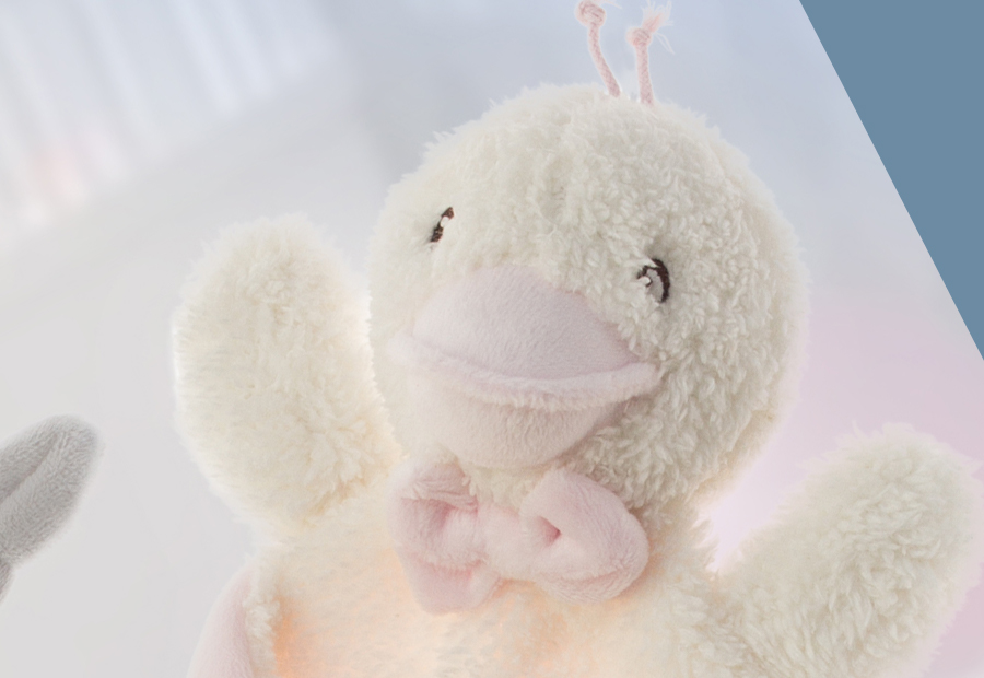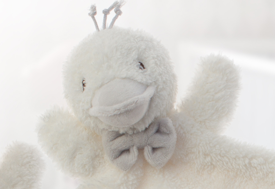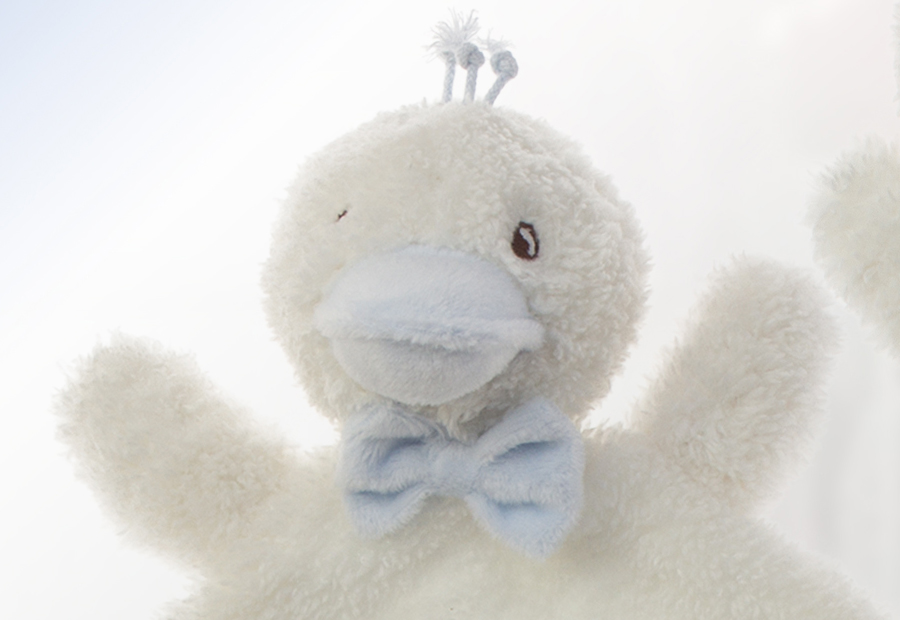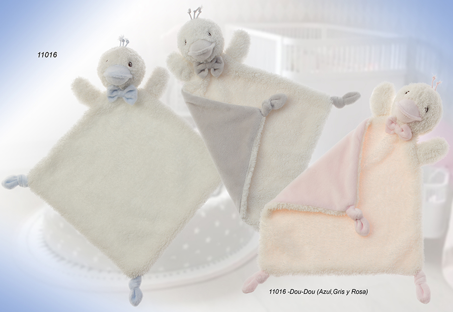 Dou dou con un tacto irresisiblemente extra suave en forma de La Pata de la marca Gamberritos. Modelo biocolor, con un reverso diferencial a tono. Packaging en bolsa de pvc y cartón impreso colgable. Detalle de pajarita.