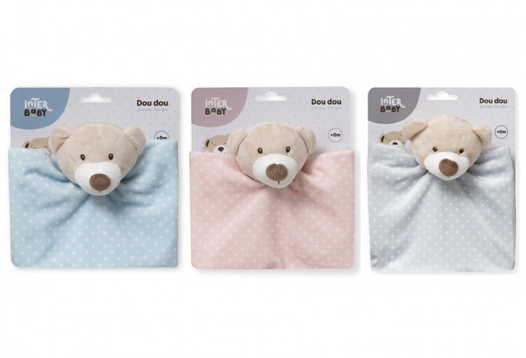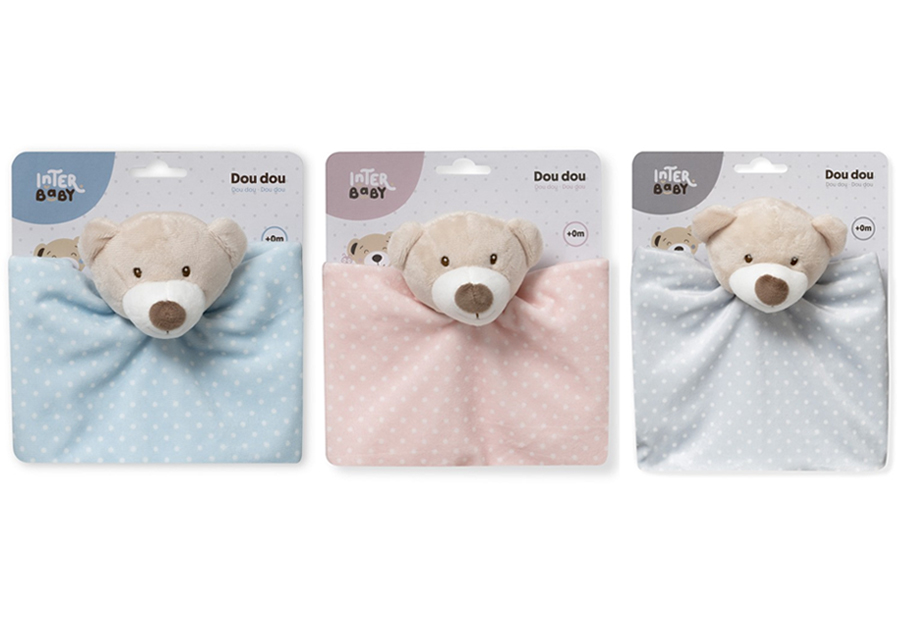 Dou Dou para recién nacidos con cascabel en el interior de la cabecita de la marca Interbaby. Tiene un tacto muy suave lo que hace muy agradable para las manitas del bebé. No se puede secar en secadora. Packaging en cartón impreso colgable y bolsa de pvc protectora. Composición: 100% Poliéster.