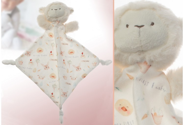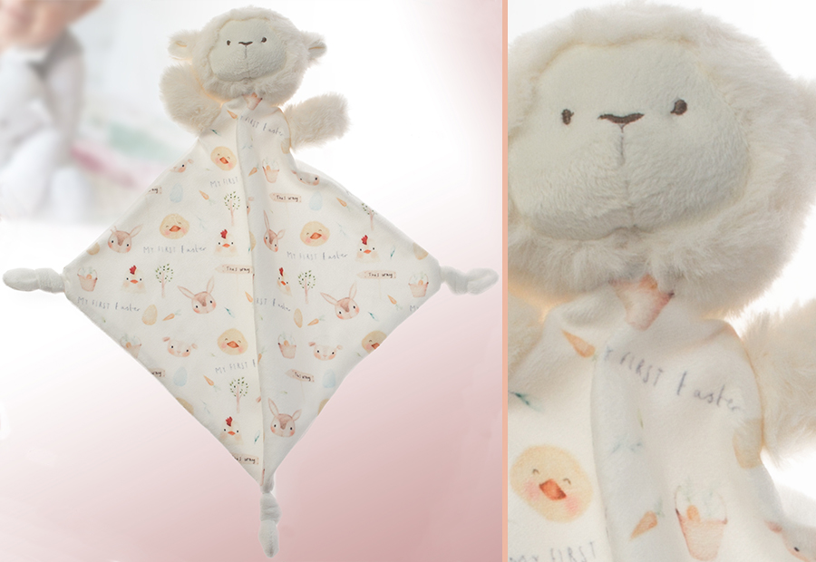 Dou dou extra suave con un diseño de animales y vegetación de una granja en forma de borreguito de la marca Gamberritos. Packaging en bolsa de pvc y cartón impreso colgable.