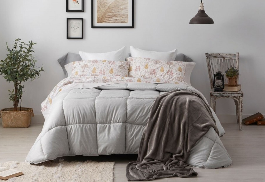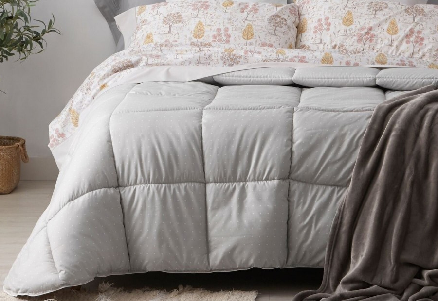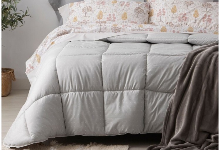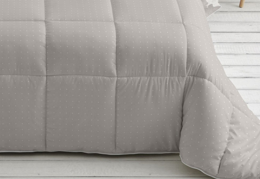 Edredon con un sutil estampado de topitos blancos sobre greige, un gris cálido y actual, define este edredón de la marca Burrito Blanco.