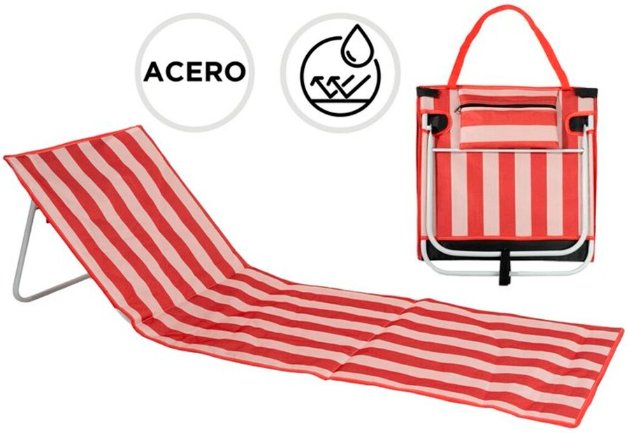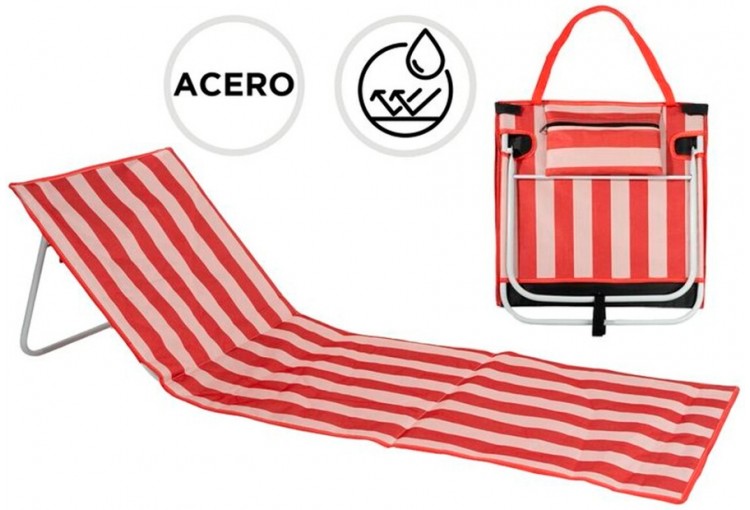 Esterilla de playa con respaldo de la marca D'CASA. Diseño en rayas bicolor. Con asa para una portabilidad muy cómoda. Material: Poliéster y metal. Tamaño: 150 x 50,5 x 40 cm. Packaging a granel con etiqueta. Peso: 1,05 kg.