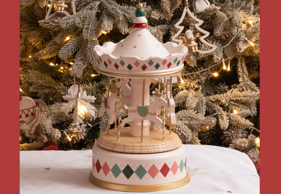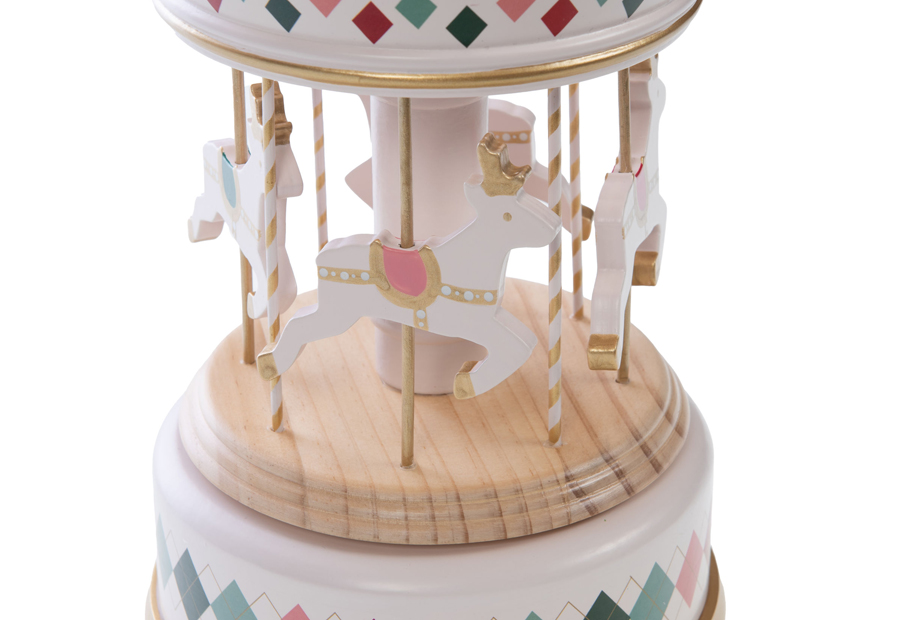 Gran carrusel giratorio musical Tio Vivo de los renos de Papa Noel hecho de madera natural de la marca Amadeus Les Petits. Tamaño: 16x16x28 cm. Ligero con un peso de 0,87 kg. Packaging en blister de pvc con lazo atado. Aporta un toque artesanal y poético. Una pieza única y muy acogedora.