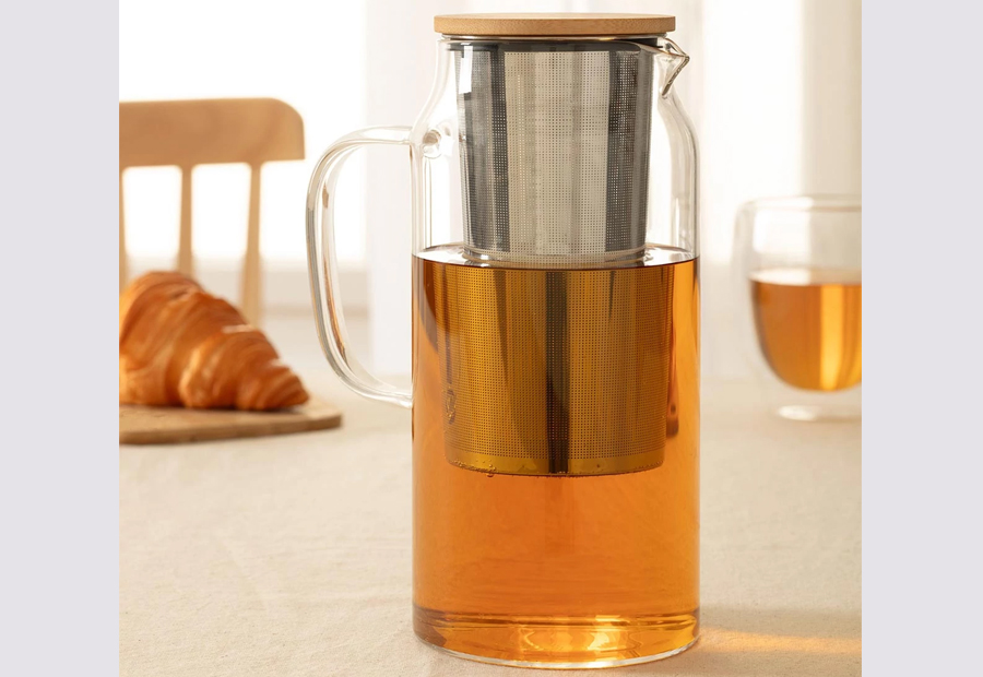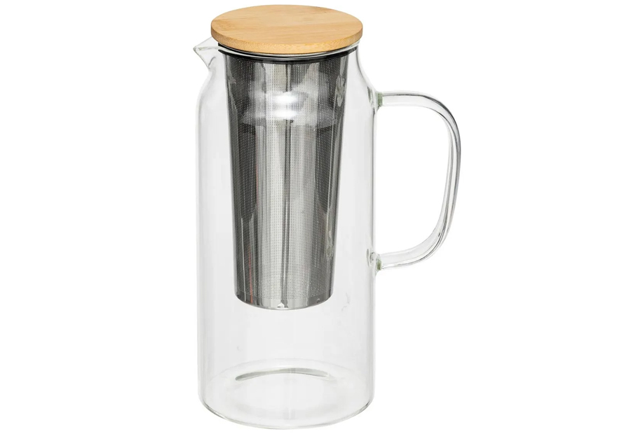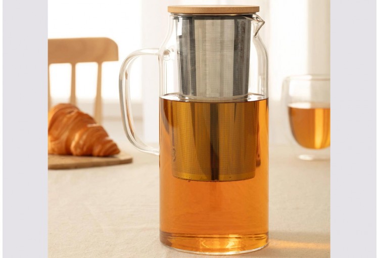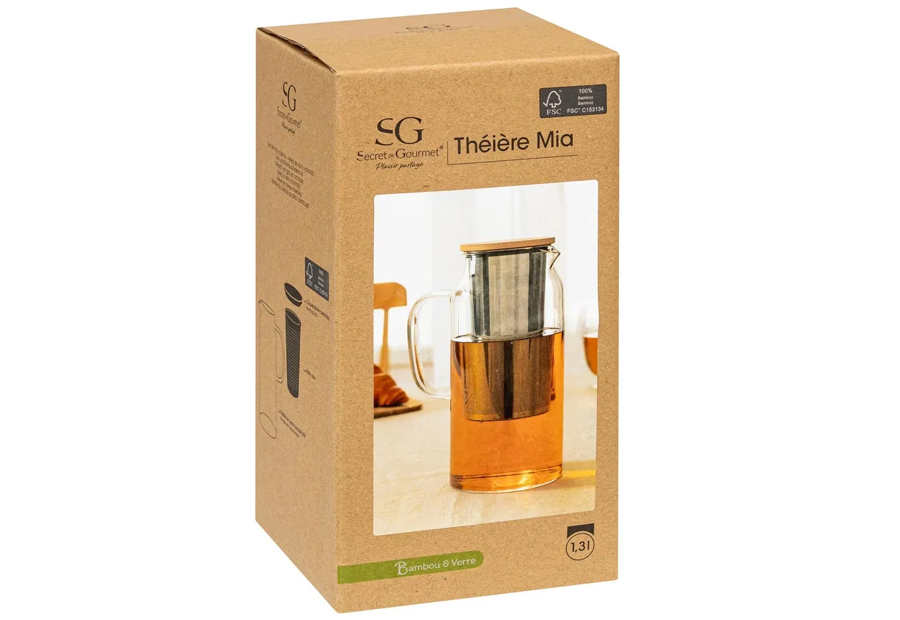Jarra tetera de cristal transparente de la marca SG. Capacidad: 1,3 Litros. Packaging en caja de cartón impresa. Tamaño: 14,7x10x21,5 cm. Filtro de té incluido. Alta resistencia al impacto.