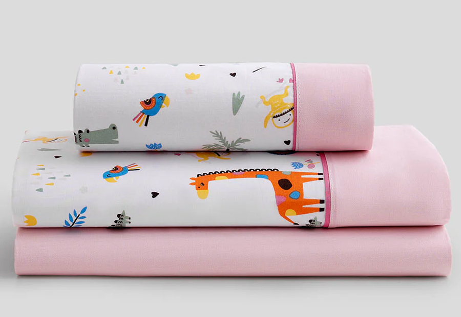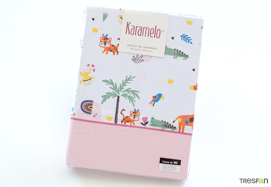 Juego de sábana tela estampada de la marca Karamelo. Relación calidad / diseño / precio recomendada. Composición: 50% Algodón - 50% Poliéster. Calidad: 30/27 pasadas m2. Altura bajera ajustable: 30 cm. Largo encimera 270 cm. Alta calidad, confeccionada con biés y aplicación. El juego contiene: Funda de almohada + bajera ajustable + funda almohada.