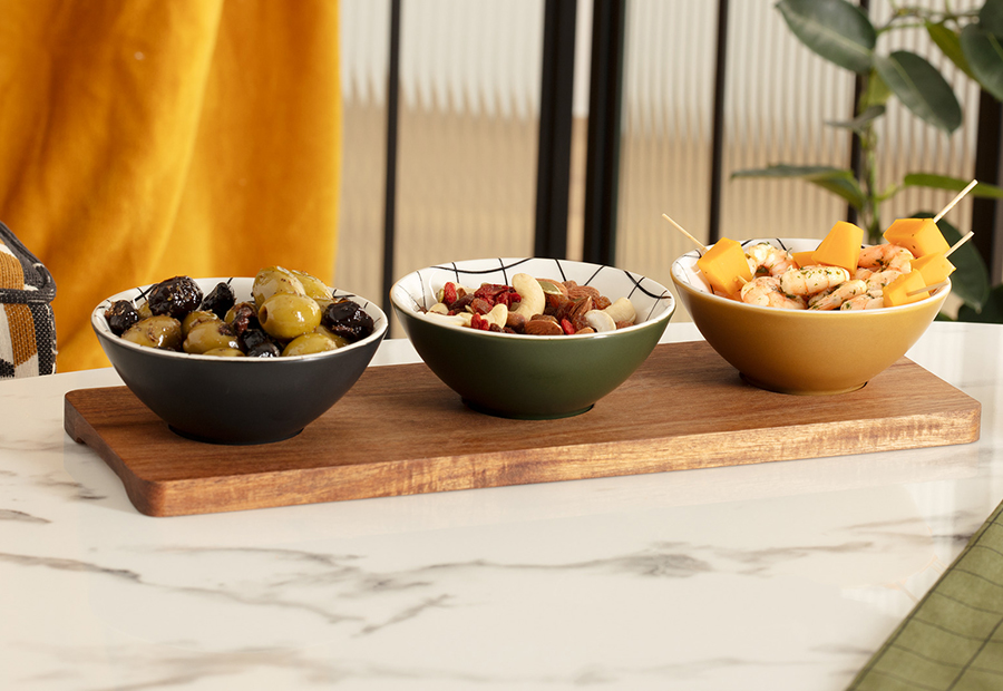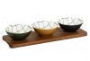 Juego para aperitivo en 4 piezas de la marca SG. Tamaño: 37 x 12,5 x 6,2 cm. Peso: 1 kg. Packaging en caja de cartón impresa. Material: Cerámica gres y madera acacia. Apto para microondas.