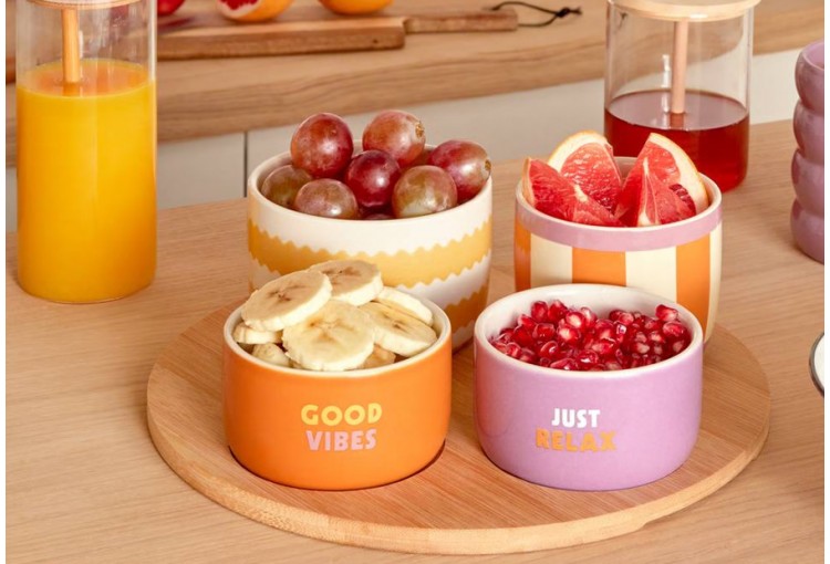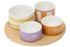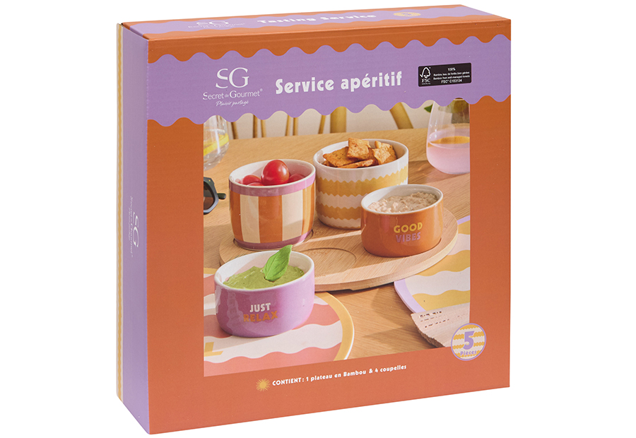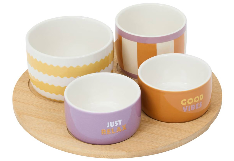Juego de aperitivo redondo en 5 piezas de la marca Atmosphera. Material: Bambú natural y Cerámica gres. Packaging en caja de cartón impresa. Apto para microondas y lavavajillas. Contiene 5 piezas: 1 bandeja de bambú y 4 cuencos de cerámica. Tamaño: 25,5 x 7,6 cm. Peso: 1,32 kg.