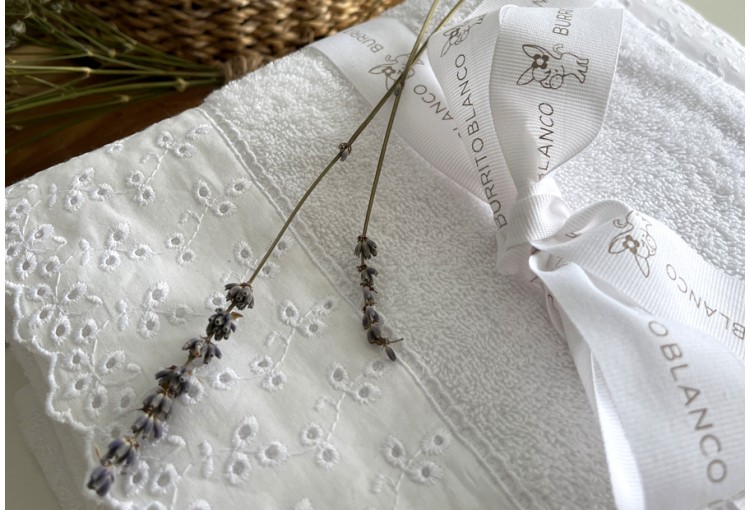 Juego de toallas en tres piezas de la marca Burrito Blanco. Tejido y diseño de puntilla de alta calidad. Gramaje rizo 500 gr. Composición: 100% Algodón. Packaging recomendado para regalo con soporte de cartón, cintas para atar y bolsa de pvc protectora. El juego contiene: 1 toalla de bidet 30x50cm, 1 toalla de lavabo 50x100cm y 1 toalla de ducha 70x140cm.