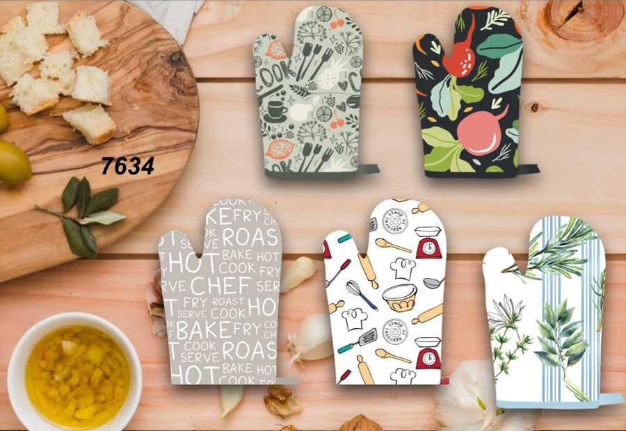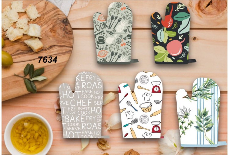 Manoplas para horno estampadas de la marca Ideal Textil. Tamaño: 15x26 cm. Se venden surtidas entre los cinco modelos disponibles. Packaging a granel. Composición: 100% Poliéster. Tejido acolchado fino para que no te quemes. Tiene colgador del mismo ribete.