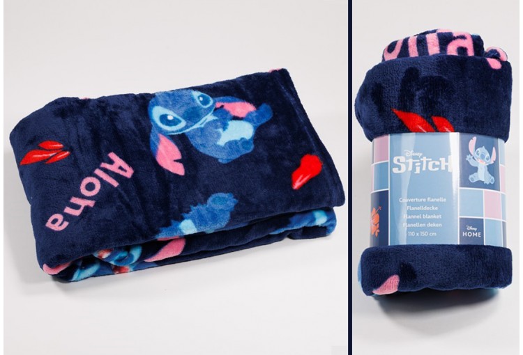 Manta plaid en tejido de coralina de la marca Disney. Manta estampada en licencia oficial de Stitch. Tamaño: 110x150 cm. Tacto muy agradable y suave. Tejido cálido, el calor que no pesa. Packaging enrollada en blister de cartón impreso.