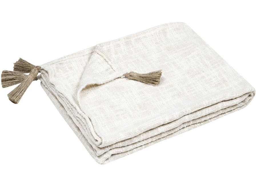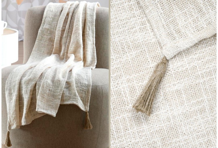 Manta plaid y Pie de cama en tejido jacquard de la marca Stof. Tamaño: 125x150 cm. Se puede utilizar como manta plaid multiusos y como pie de cama. Composición: 100% Algodón. Packaging a granel, con blister de cartón impreso con fotografia e información y percha para colgar.