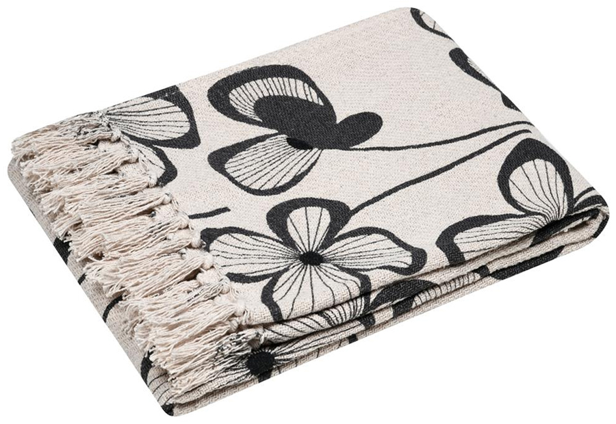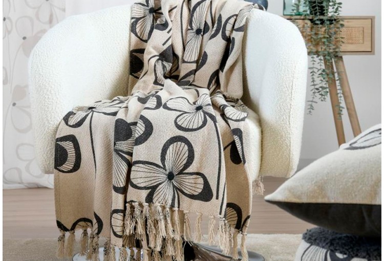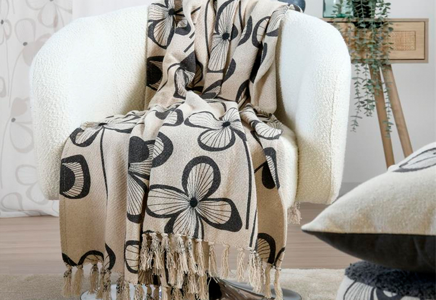 Manta plaid y Pie de cama en tejido jacquard de la marca Stof. Tamaño: 125x150 cm. Se puede utilizar como manta plaid multiusos y como pie de cama. Composición: 100% Algodón. Packaging a granel, con blister de cartón impreso con fotografia e información y percha para colgar.