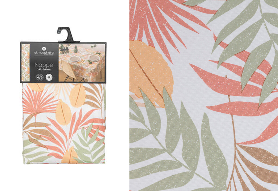 Mantel antimanchas estampado de la marca Atmosphera. Tamaño: 140x240 cm. Para 6/8 comensales. Composición: 100% poliéster.