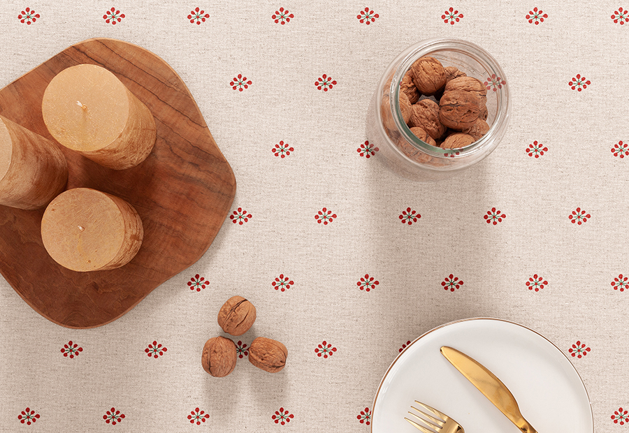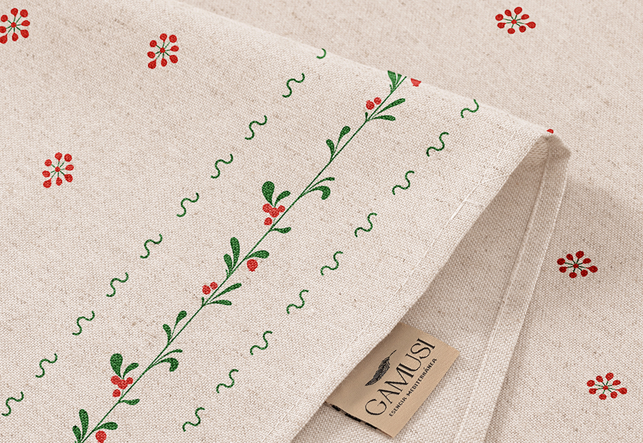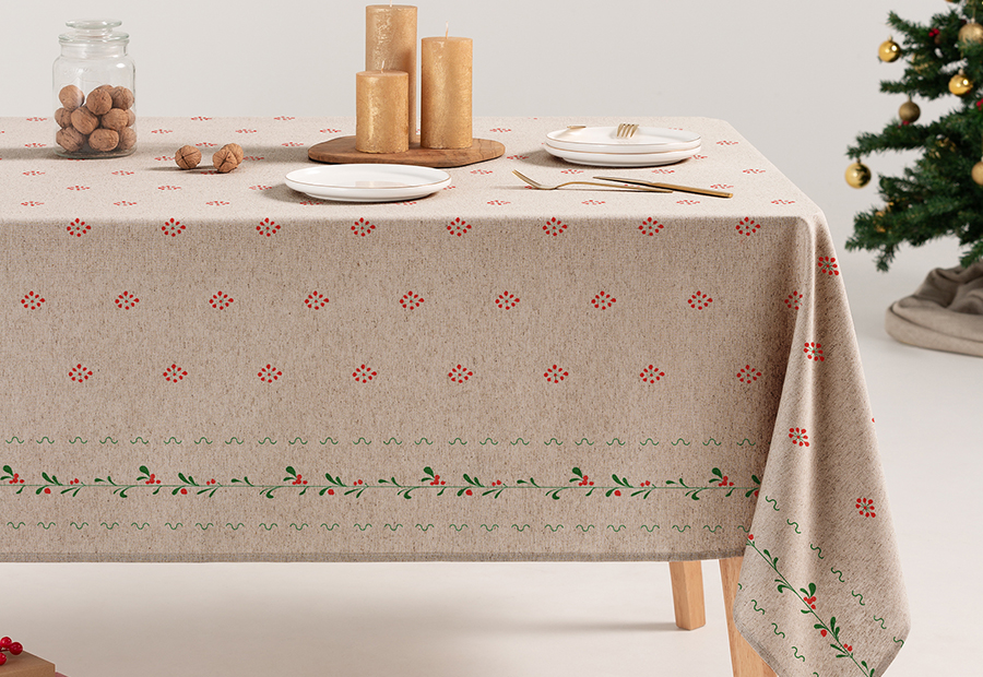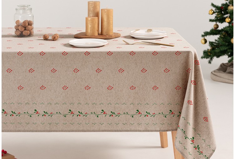 Mantel navideño con lino en tejido jacquard estampado de la marca Gamusi. Composición: 60% Algodón - 30% Poliéster - 10% Lino. Fabricado en España.