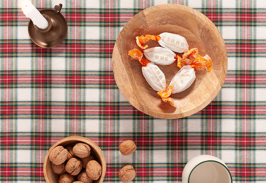 Mantel navideño en tejido jacquard de la marca Gamusi. Composición: 70% Algodón - 30% Poliéster. Detalles en hilo brillante Lurex. Fabricado en España.