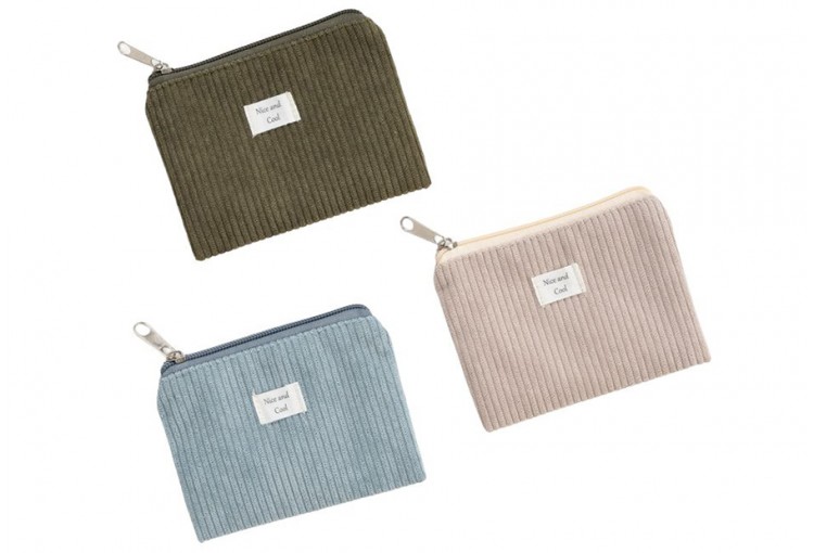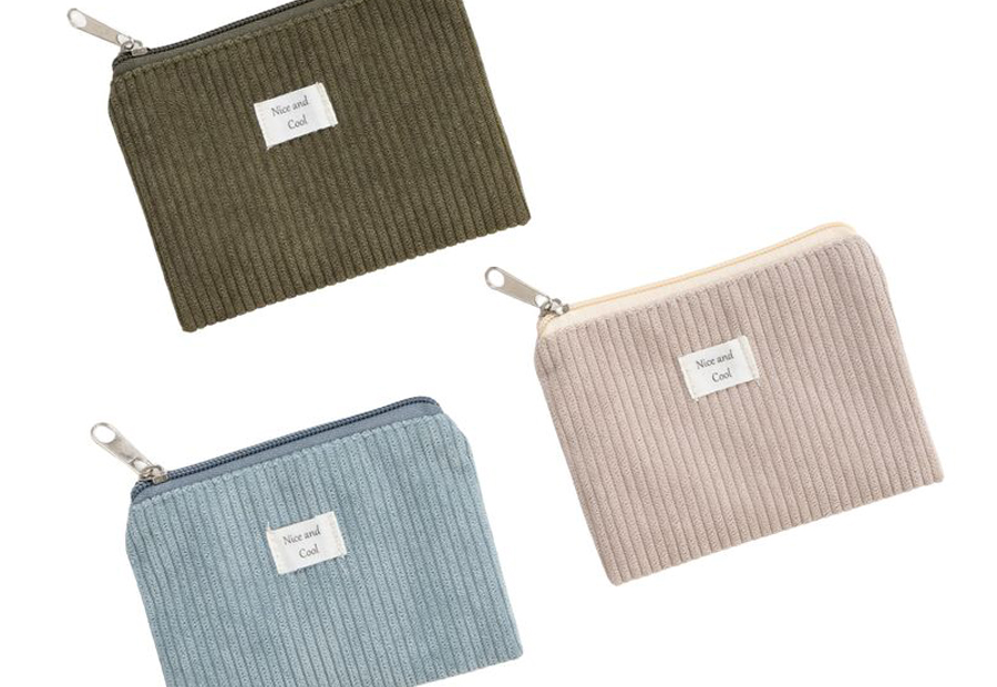 Monedero en tejido de pana con cremallera D'CASA. Tres colores a elegir: verde, rosa y azul. Tamaño: 10 cm altura x 13 cm de ancho. Composición: 100% Poliéster. Packaging a granel con etiqueta.