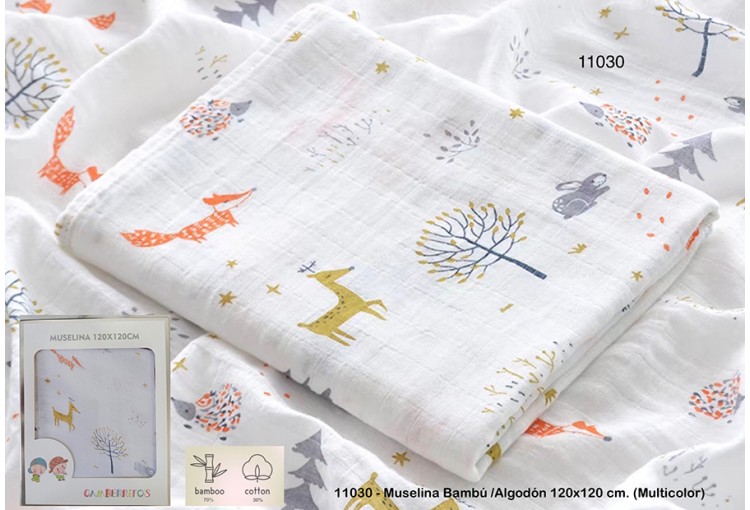 Muselina estampada de la marca Gamberritos. Tamaño grande de 120x120 cm. Composición: 70% Bambú - 30% Algodón. Packaging en caja de cartón impresa.