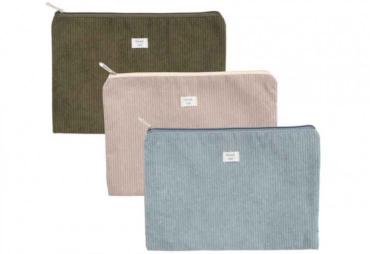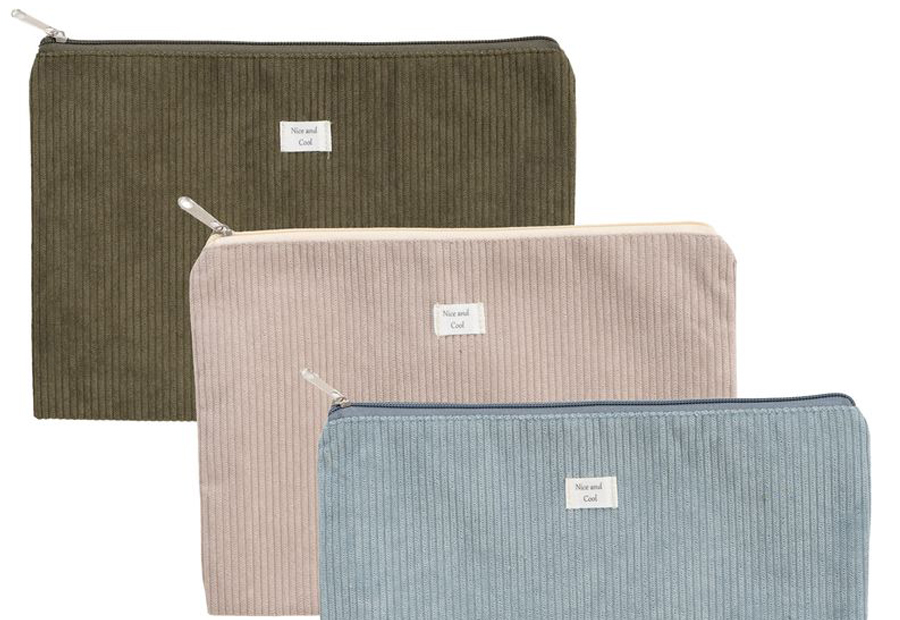 Neceser plano en tejido de pana con cremallera D'CASA. Tres colores a elegir: verde, rosa y azul. Tamaño: 20 cm altura x 27 cm de ancho. Composición: 100% Poliéster. Packaging a granel con etiqueta.