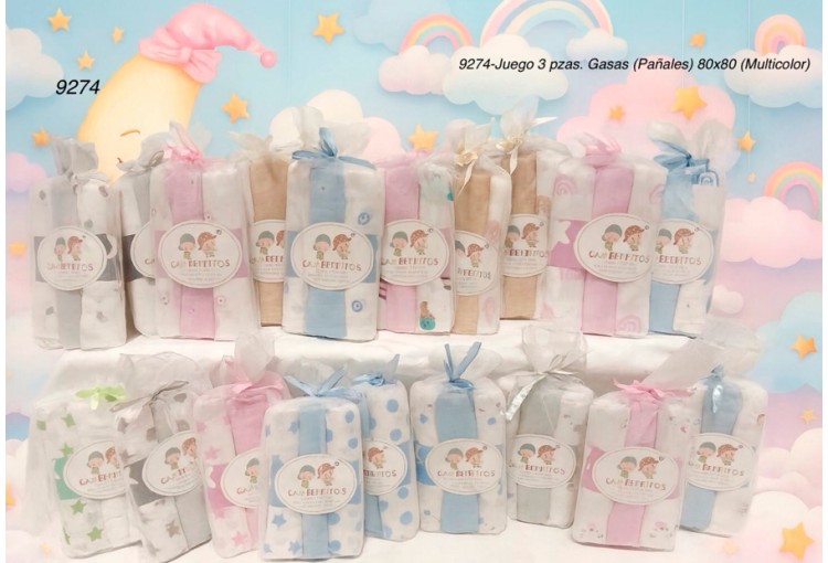 Pañales de gasas estampadas de la marca Gamberritos. Tamaño de 80x80 cm. Se vende en un pack de 3 gasas en modelos y colores surtidos. Gasa Estampada 100% Algodón. Este producto es muy recomendable por su gran uso diario y el precio tan favorable para su venta.