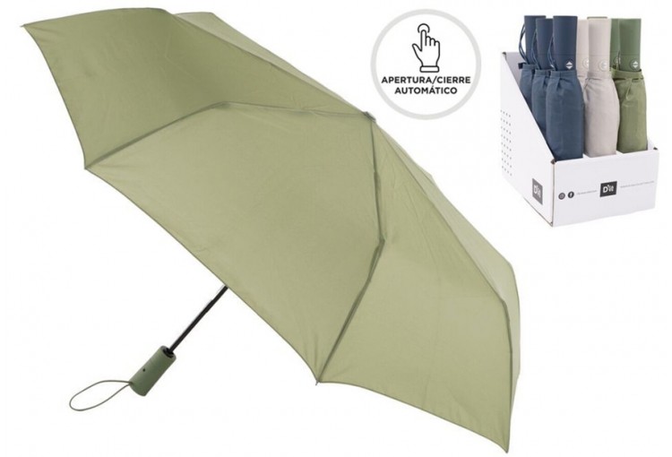 Paraguas plegable con apertura automática de la marca D'CASA. Tamaño: 30,5x5x5 cm. Material: fibra antiviento. Peso: 0.42 kg. Se vende surtido entre los tres colores disponibles.
