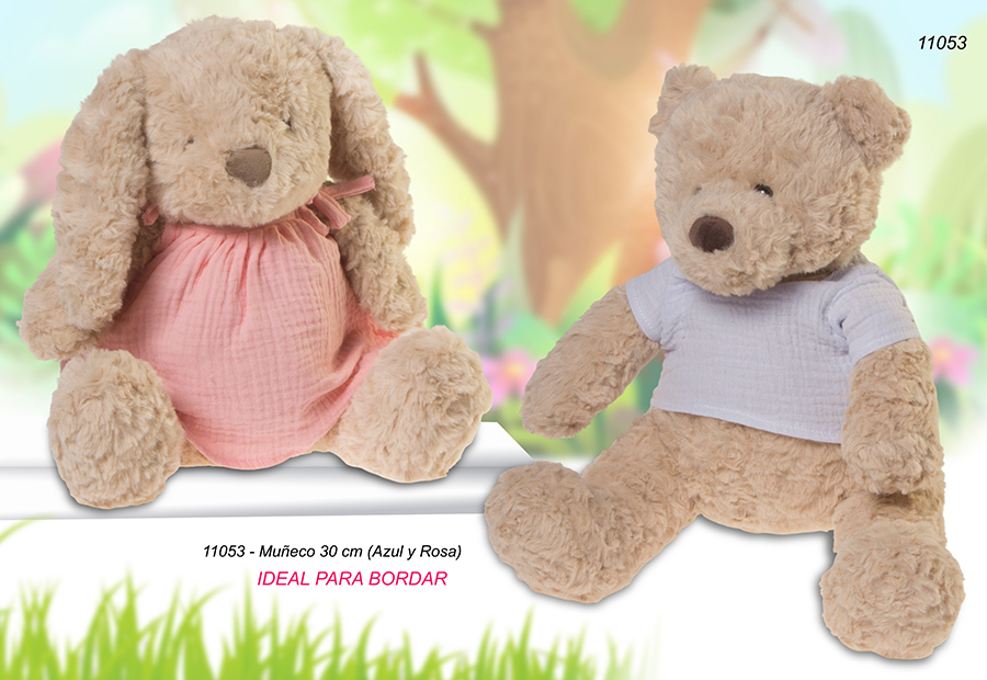 Peluche en forma de osito y conejo ideal para bordar de la marca Gamberritos. Altura de 30 cm. Dos colores disponibles: Rosa (conejo) - Azul (oso). El conejo se quita el vestido para facilitar su personalización deshaciendo el nudo de los tirantes del vestido. En el caso del oso, la camiseta se quita con velcro. Packaging en bolsa de pvc protectora.