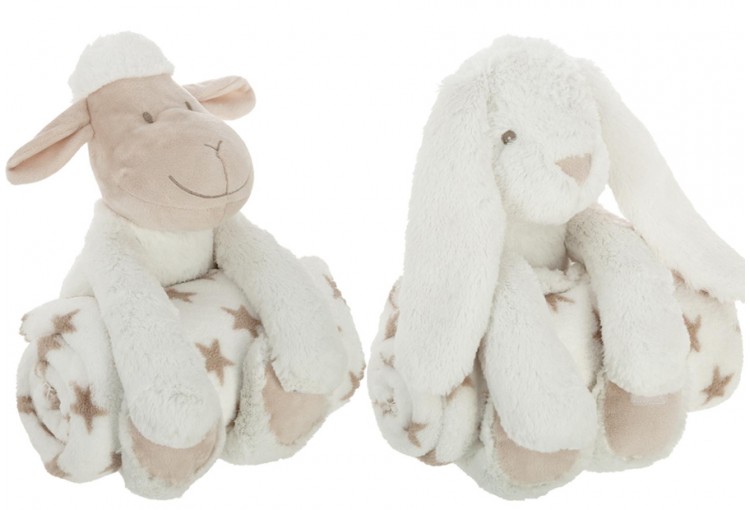 Peluche en forma de oveja y conejo + Manta estampada con estrellas de la marca Atmosphera. Tamaño manta: 75x100 cm. Tamaño peluche: alt 25 cm.