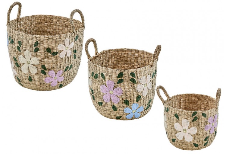Set de tres cajas con asas de almacenamiento de la marca Atmosphera. El set incluye tres cestas, una por tamaño diferente. Alturas de cestas: 37 cm - 32 cm - 26 cm. Motivos florales bordados ideal para agregar un toque rústico a tu decoración. Cestas de caña de junco.