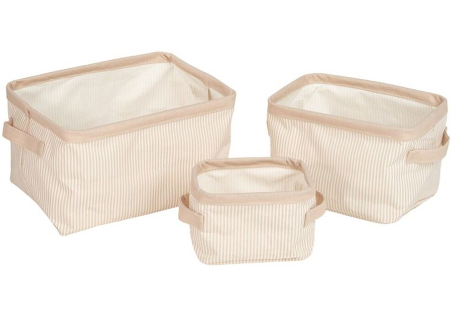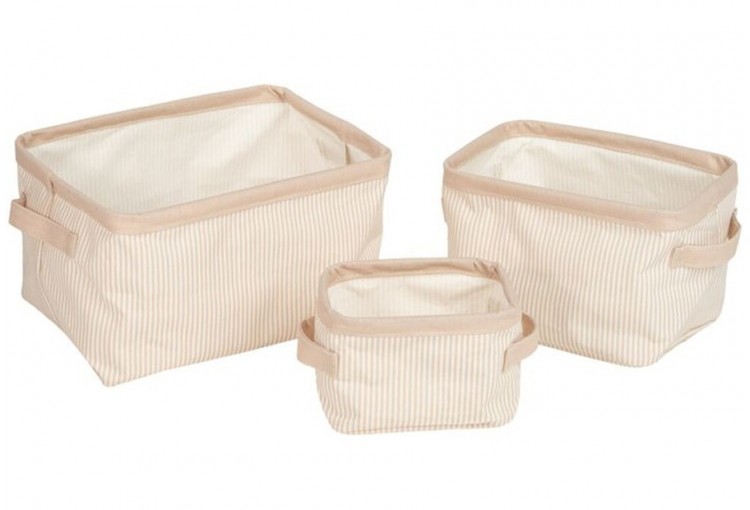 Set de tres cestas de almacenamiento a rayitas, una por tamaño, de la marca D'CASA. Material: Poliéster. Peso: 0,34 kg. Packaging a granel con etiqueta. Tamaño cesta grande: 28x20x16 cm.