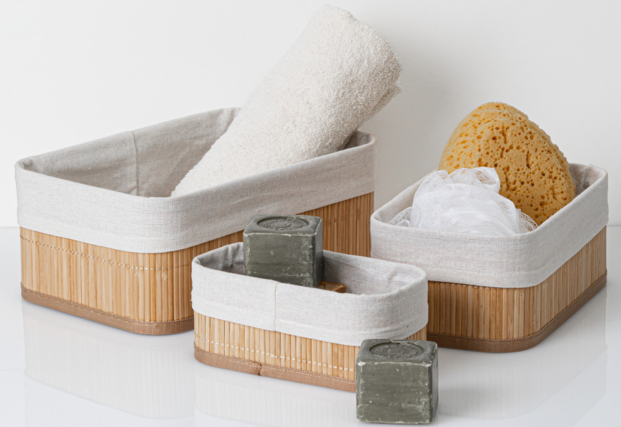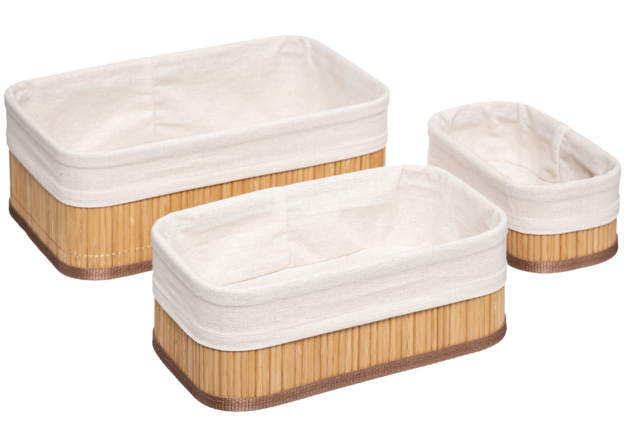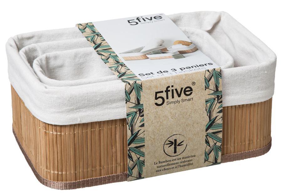 Set que contiene tres cestas de bambú natural de la marca 5Five. Tamaños disponibles: L: 30x20x12cm - 361g. M: 25x15x10cm - 246g. S: 20x10x8cm - 147g.
