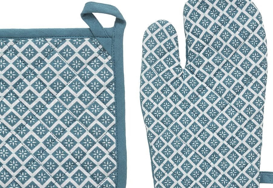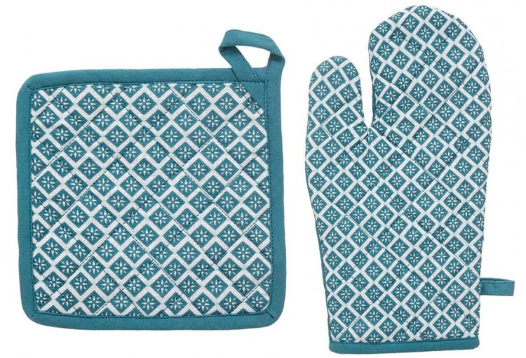 Set Guante + Agarradera para cocina de la marca Atmosphera. Tamaño: 20x2x20 cm. Peso: 0,160 kg. Composición: 100% Algodón. Packaging a granel con etiqueta. Se puede lavar en lavadora. Imprescindible para sacar tus platos del horno sin quemarte.