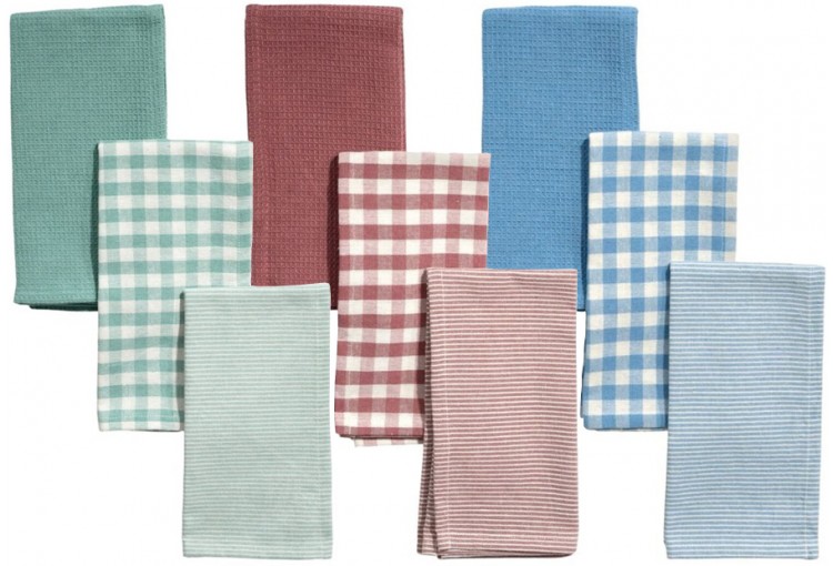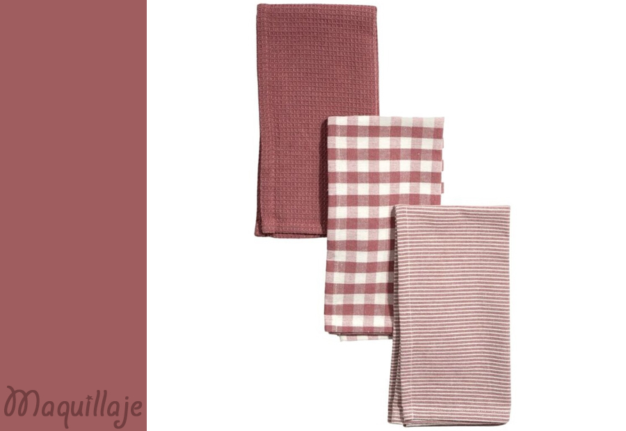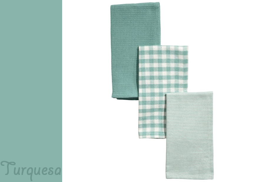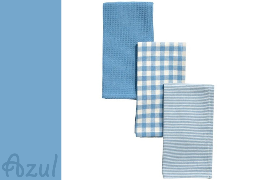 Set que contiene tres paños de cocina, uno liso, uno a rayas y otro a cuadros vichy de la marca D'CASA. Tejido jacquard de alta calidad en 100% algodón. Tamaño paño: 50x50 cm. Packaging a granel con percha para colgar. Tres colores disponibles: turquesa, maquillaje y azul. Colores de tendencia.