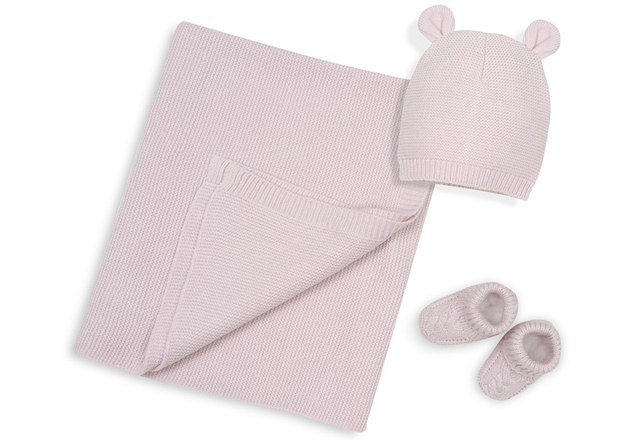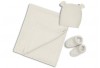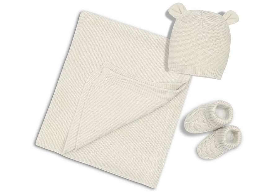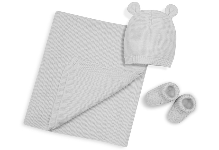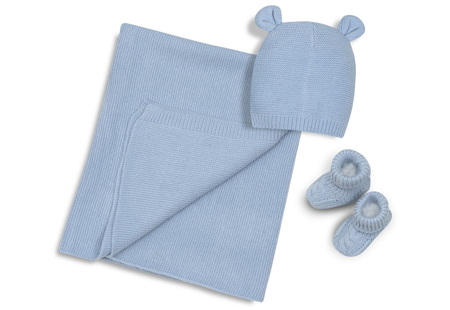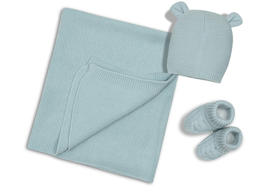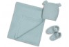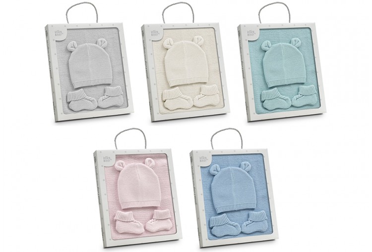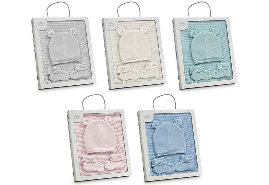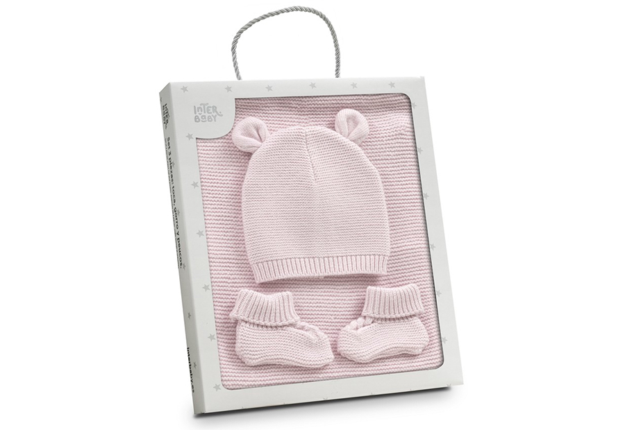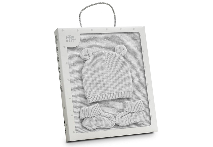 Set de regalo que contiene 3 piezas de la marca Interbaby: Compuesto por 1 toca, 1 gorro y 1 par de peucos. Cinco colores disponibles: azul, beige, gris, verde y rosa. Composición: 100% Acrílico. Confeccionado con hilo extra suave, confortable y calidez asegurada. Packaging en caja de cartón impresa, asa de cordón y blister de pvc.