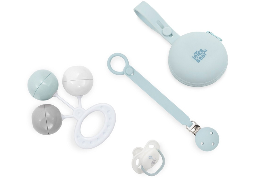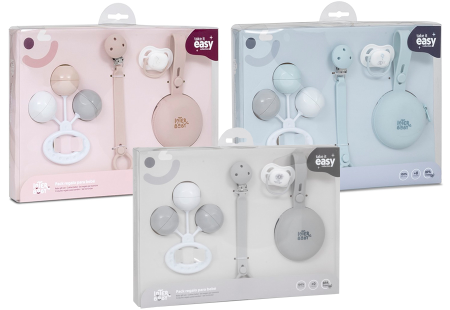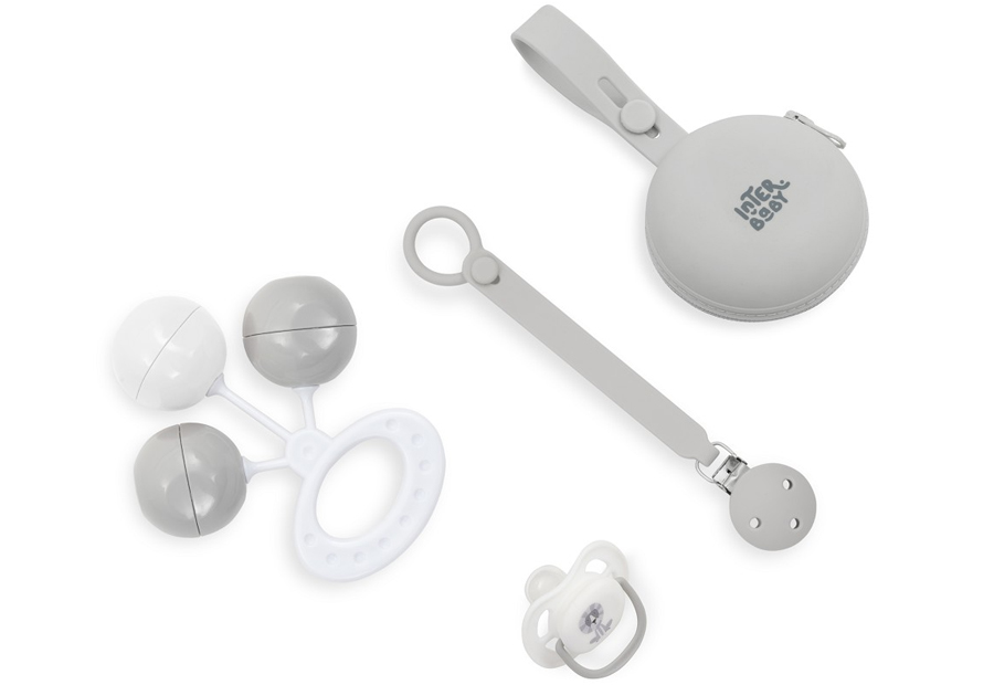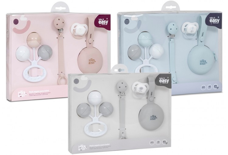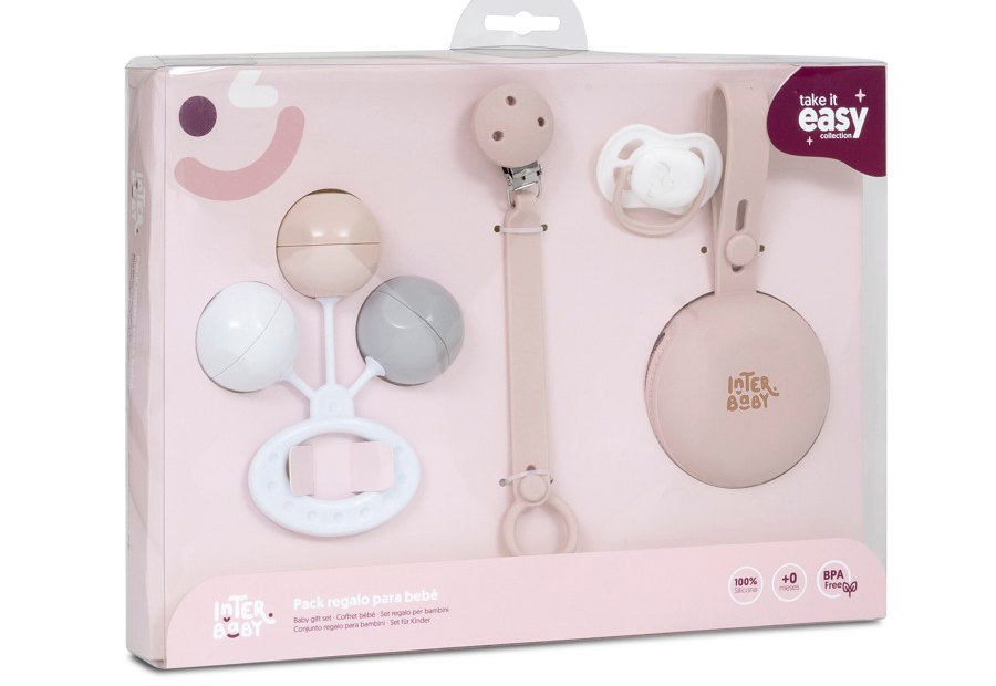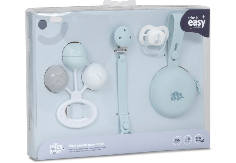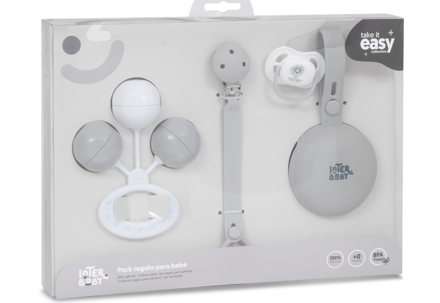 Set de regalo que contiene 4 piezas de la marca Interbaby. Material: Silicona. Contiene: 1 sonajero, 1 chupete, 1 chupetero y 1 porta chupete. Libre de BPA, PVC y ftalatos. Packaging recomendado para regalo. Edat: A partir + 0 meses.