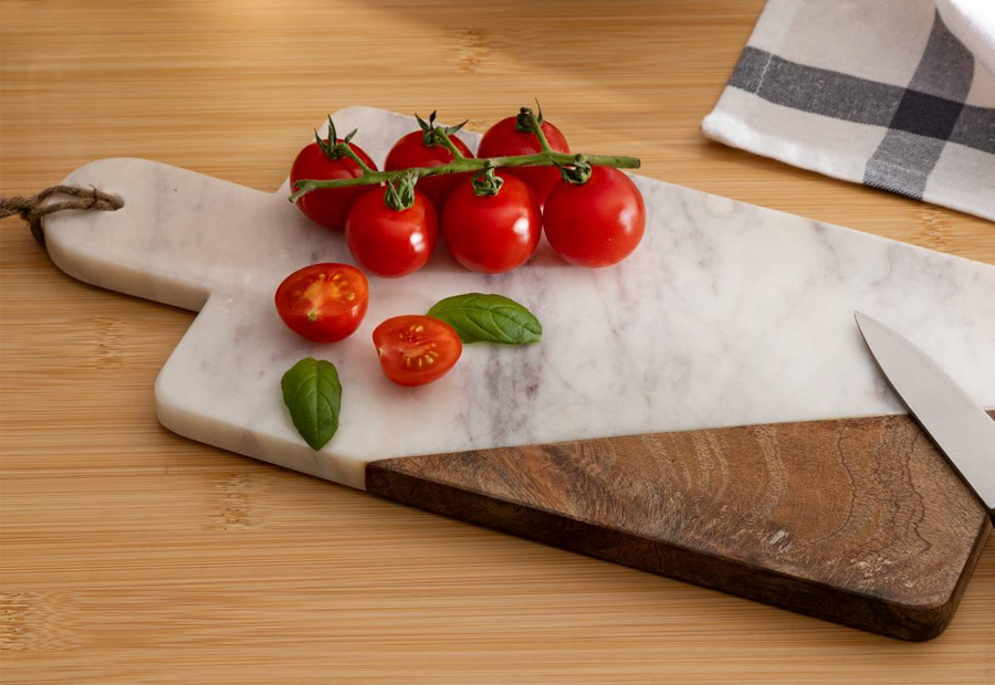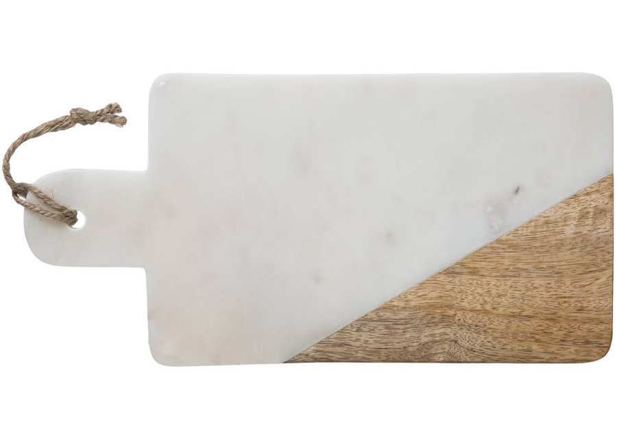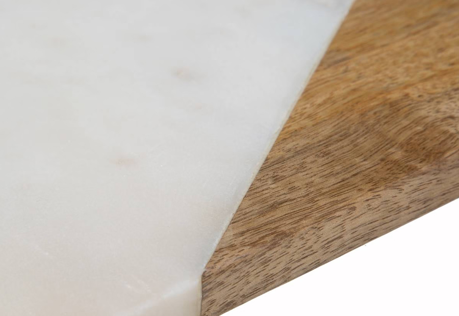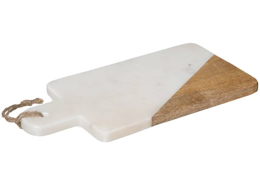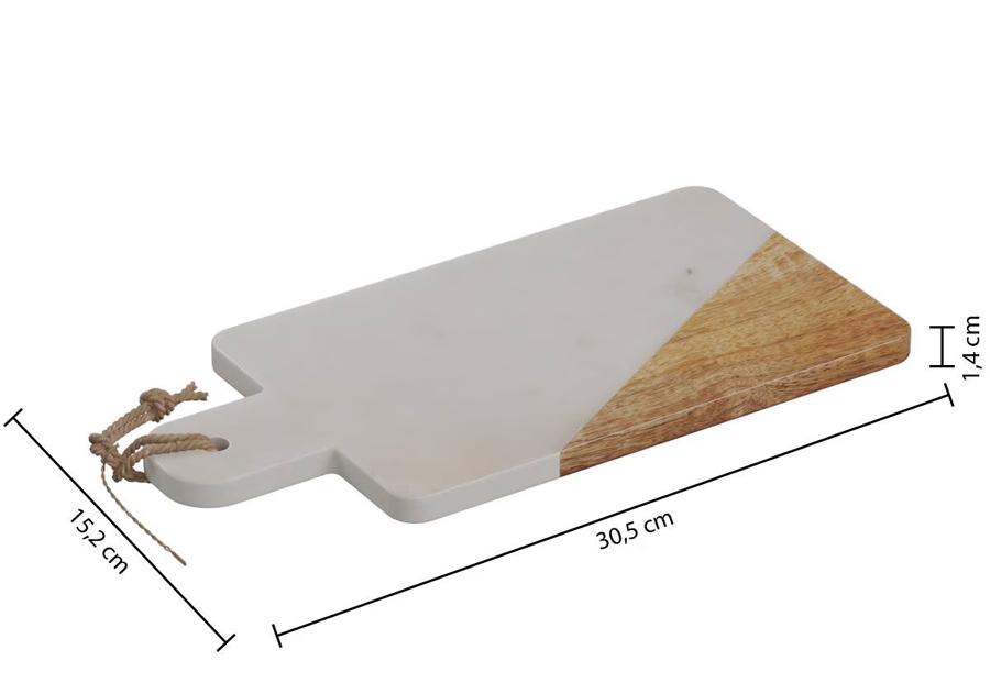 Tabla de presentación en mármol blanco y madera de la marca Atmosphera. Tamaño: 30,5 x 15,5 x 1,4 cm. Peso: 1,6 kg.