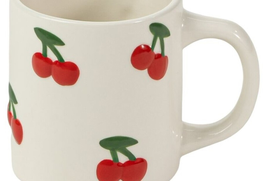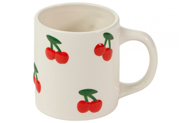 Taza mug coquette con cerezas en textura de la marca D'CASA. Tamaño: 9,5 x 9,5 x 13 cm. Material: Cerámica. Packaging a granel con etiqueta. Peso: 0,33 kg.