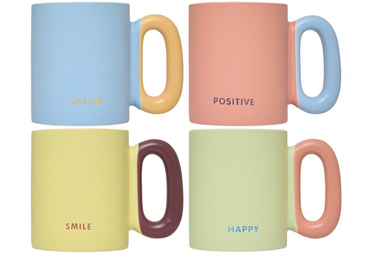 Taza mug de porcelana fina de la marca Atmosphera. LLeva un mensaje de alegría con esta creativa taza con unos colores muy alegres. Capacidad: 340 ml. Material: Porcelana. Apta para microondas y apta para lavavajillas. Tamaño: 11,5 x 8 x 10 cm (largo x ancho x alto). Packaging a granel con etiqueta. Cuatro colores disponibles: azul, verde, rosa y amarillo.