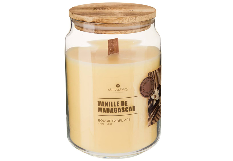 Vela aromática con tarro de vidrio de la marca Atmosphera. Tamaño: 9x13 cm. Peso: 0,65 kg. Tapa de madera de bambú. Peso de cera: 435 g. Tiempo de combustión: 60 h. Mecha de madera.